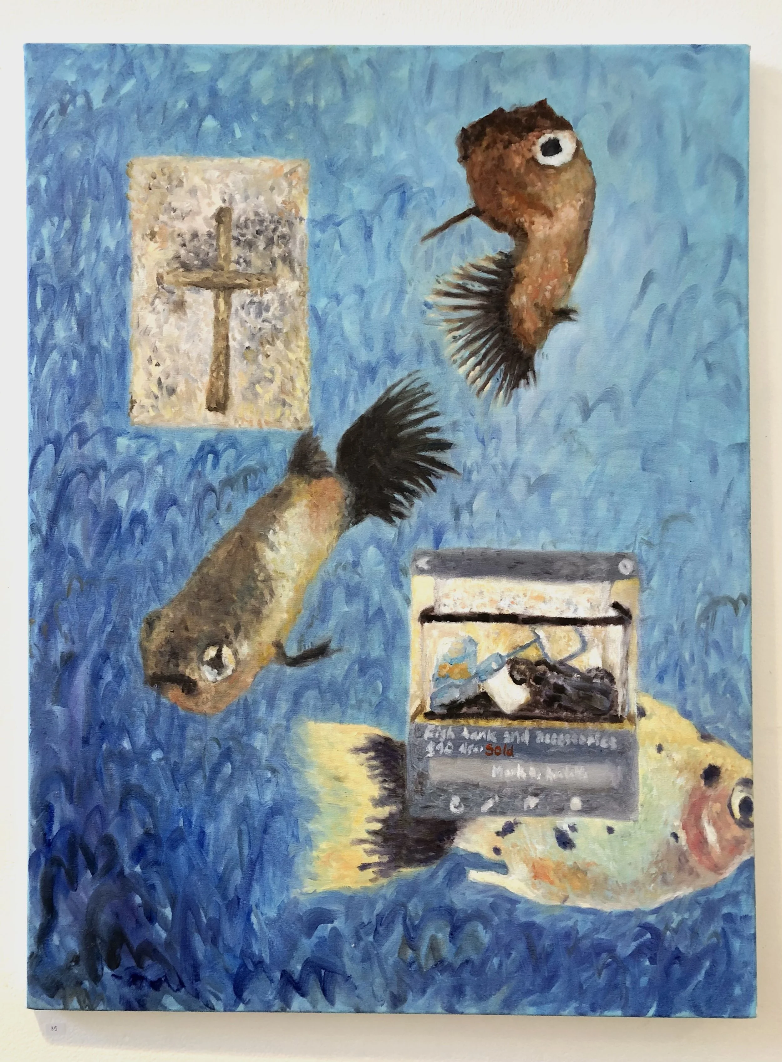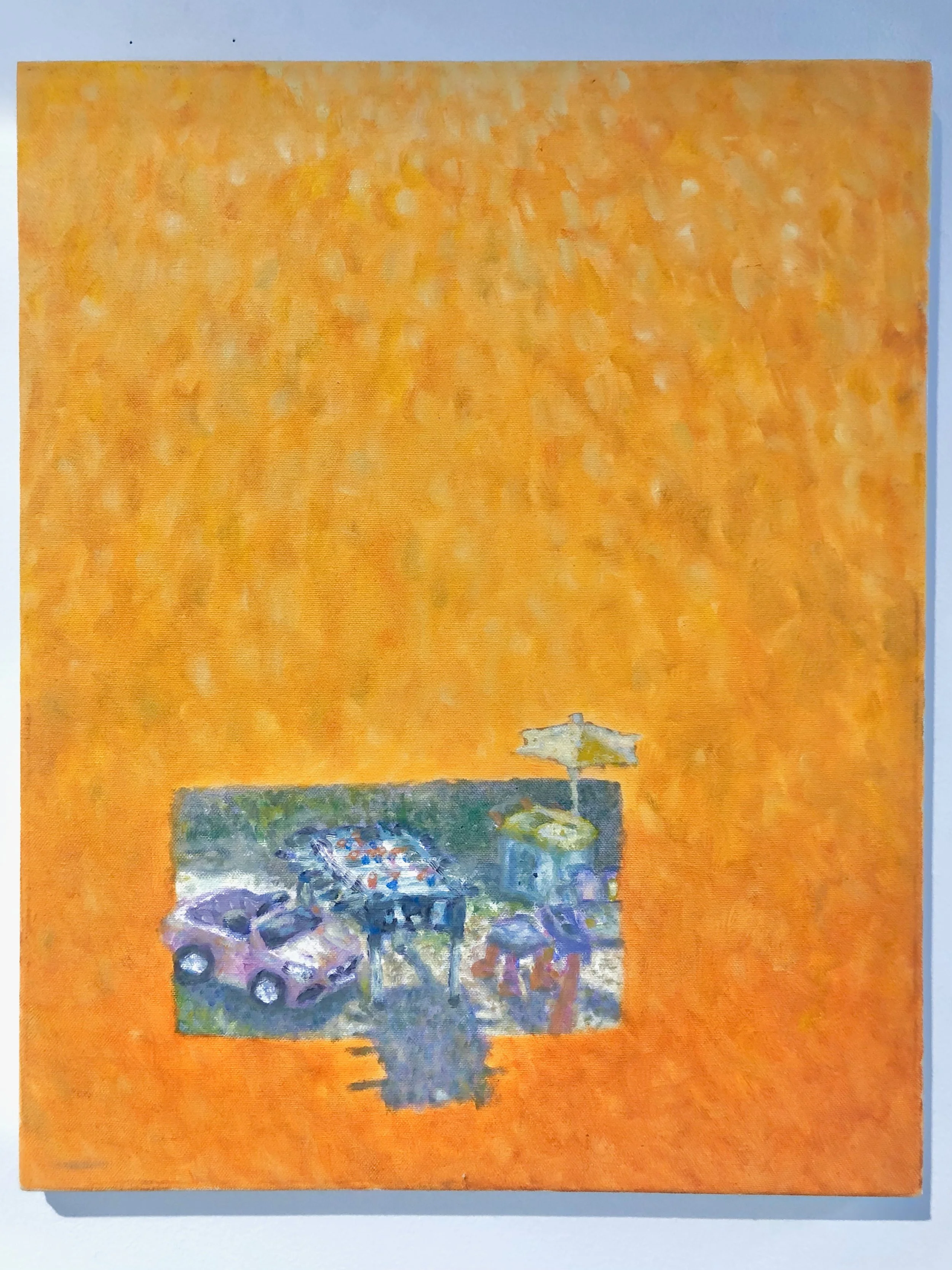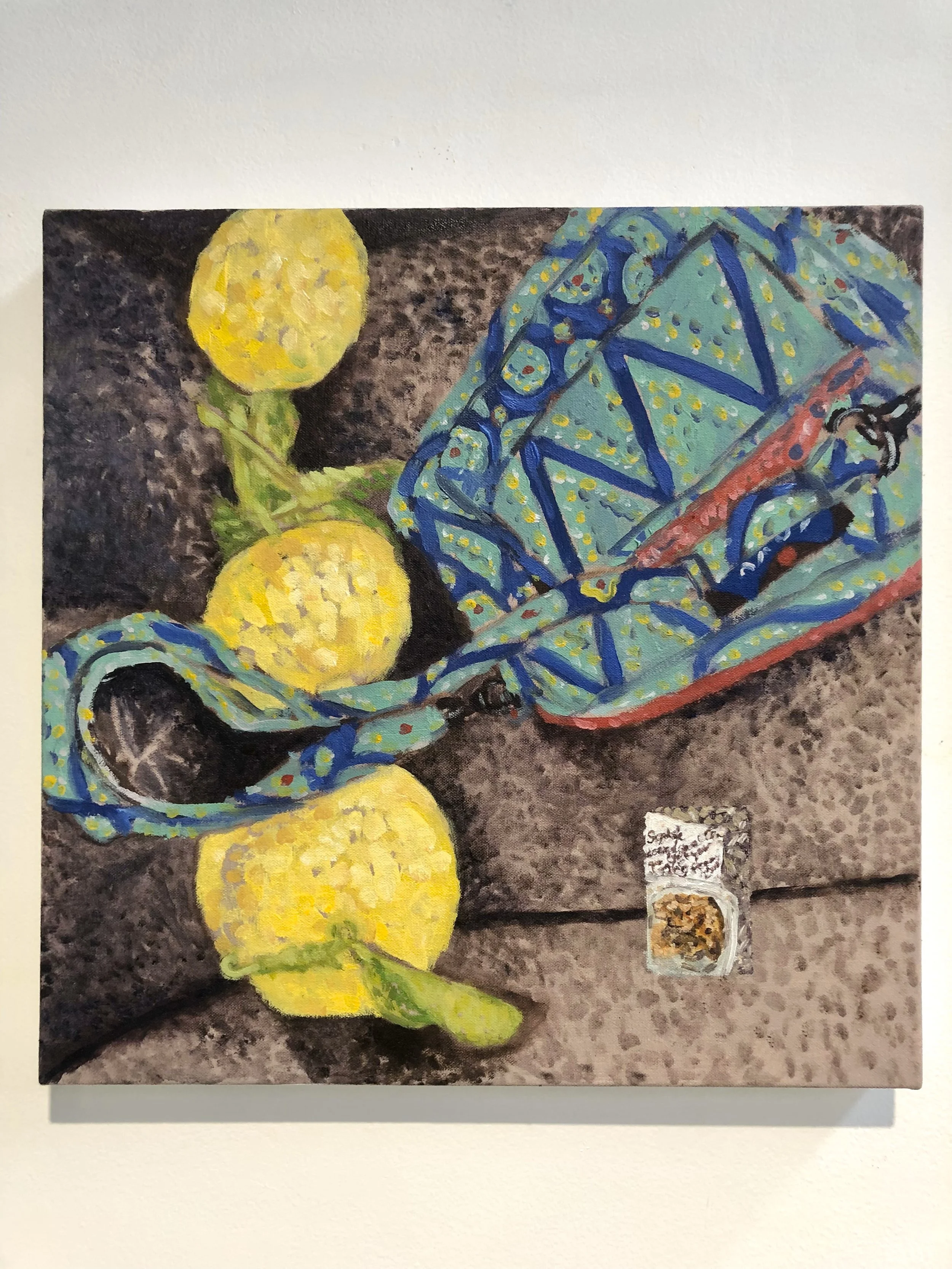 ins and outs 'peter's birthday fish', 2023, oil on canvas. 'baby's mercedes', 2023, oil on canvas. 'grapefruits;persian lovecake', 2023, oil on canvas. 'dessert after dinner', 2023, oil on canvas. Artist’s own images.