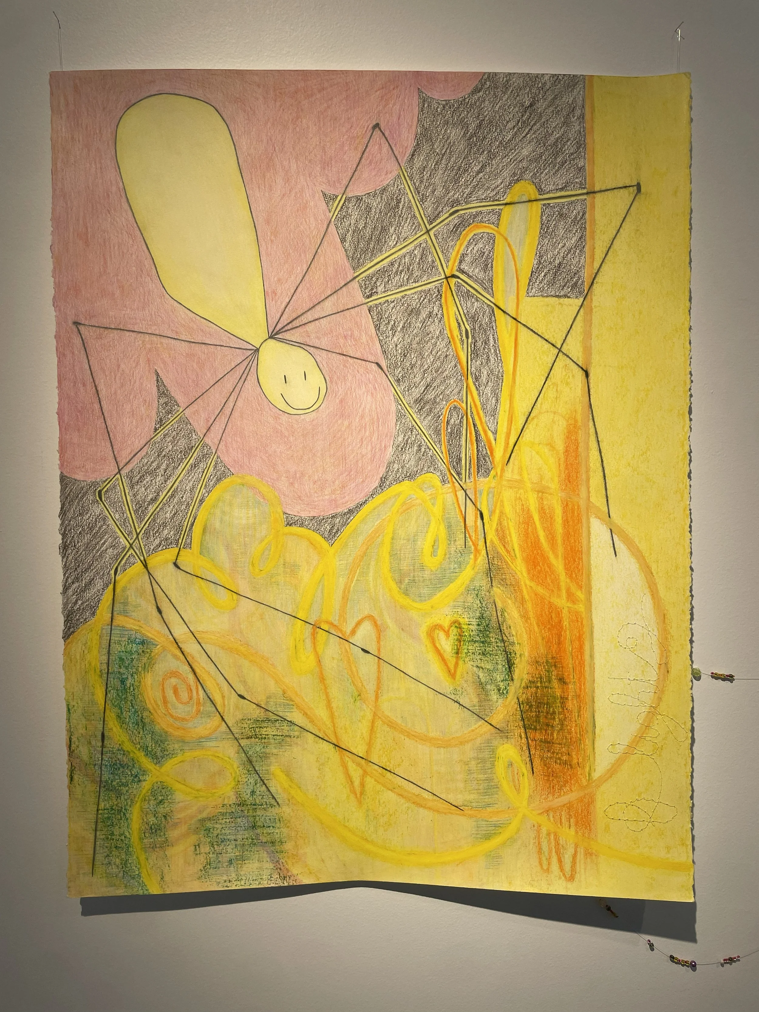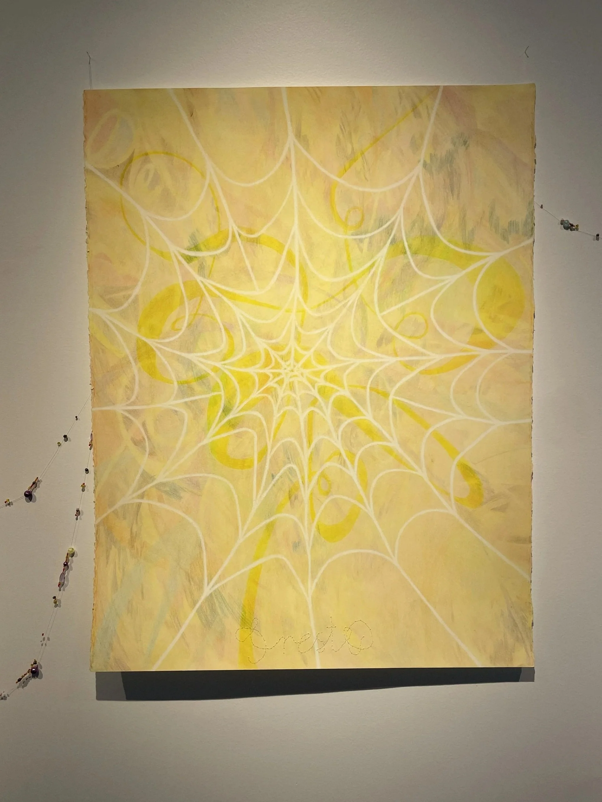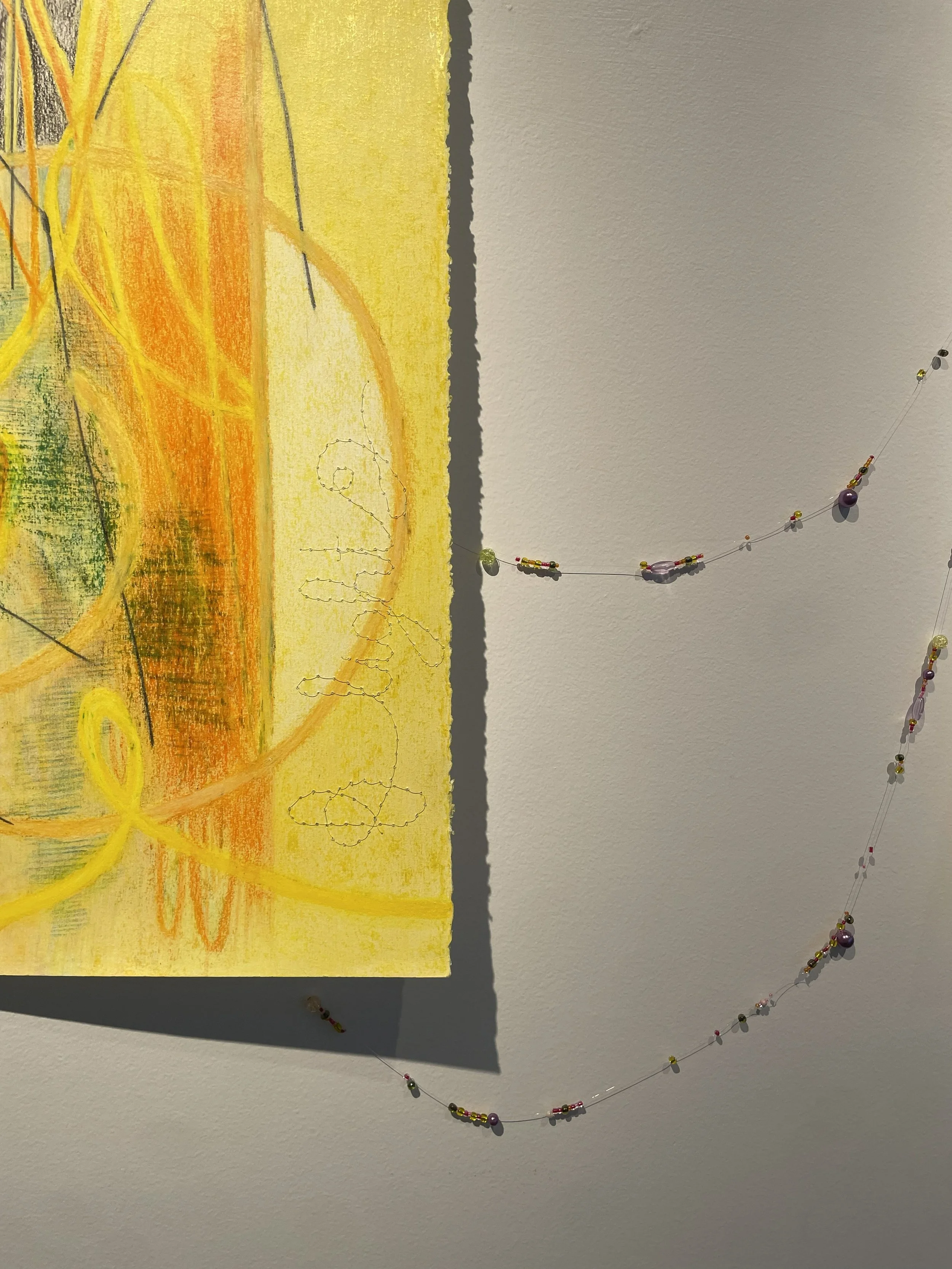 The process of both drawing and erasing allows for detailed layering, creating a depth that magnifies the miniature worlds of my subject matter. Fishing line and beading mimic the webs of spiders and allude to a lingering presence who is quietly claiming their territory. Overall, my choice in abstraction lends itself to a poetic and whimsical narrative aimed at contemplating the spaces we occupy and those we may or may not choose to share them with.