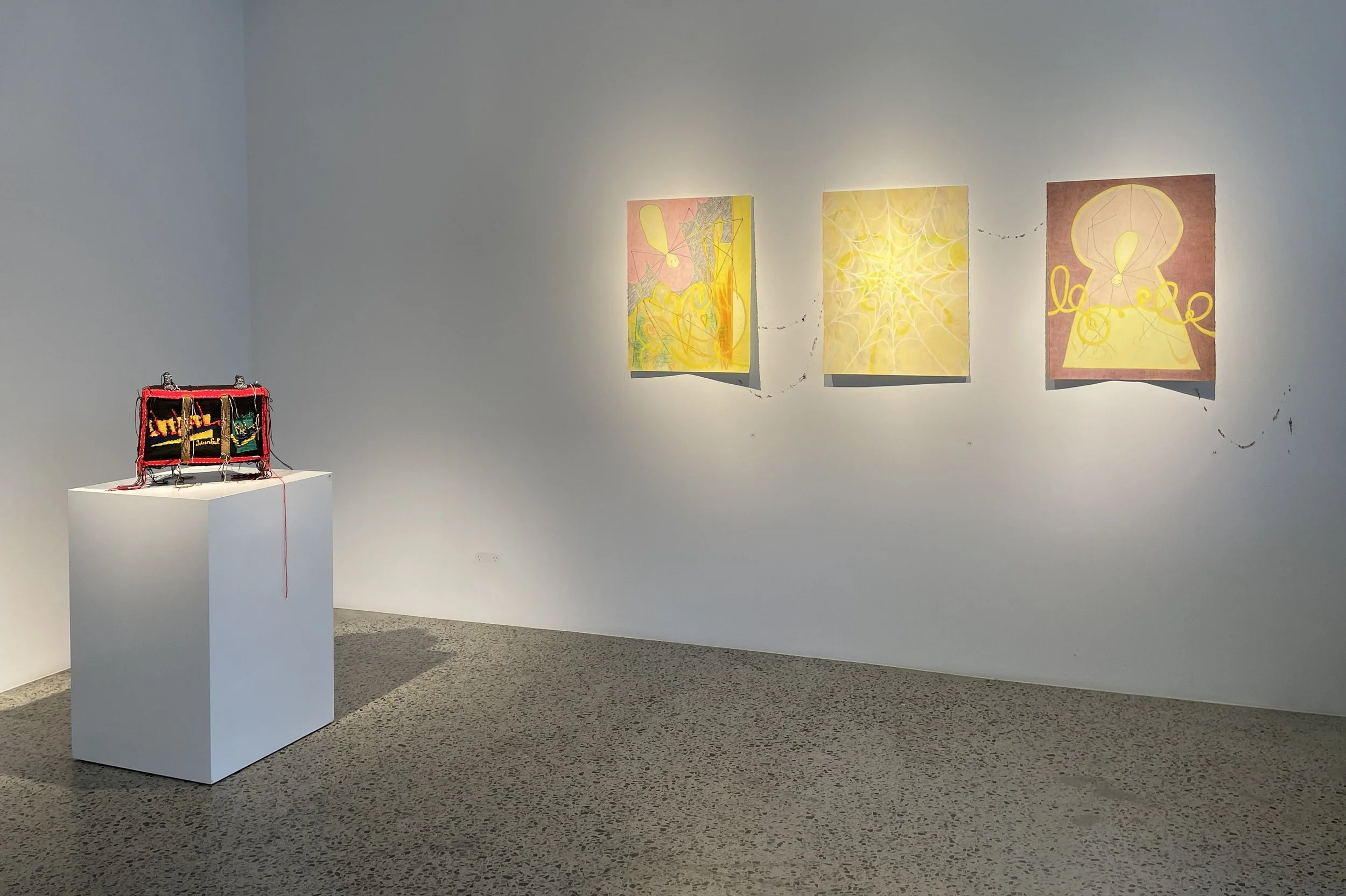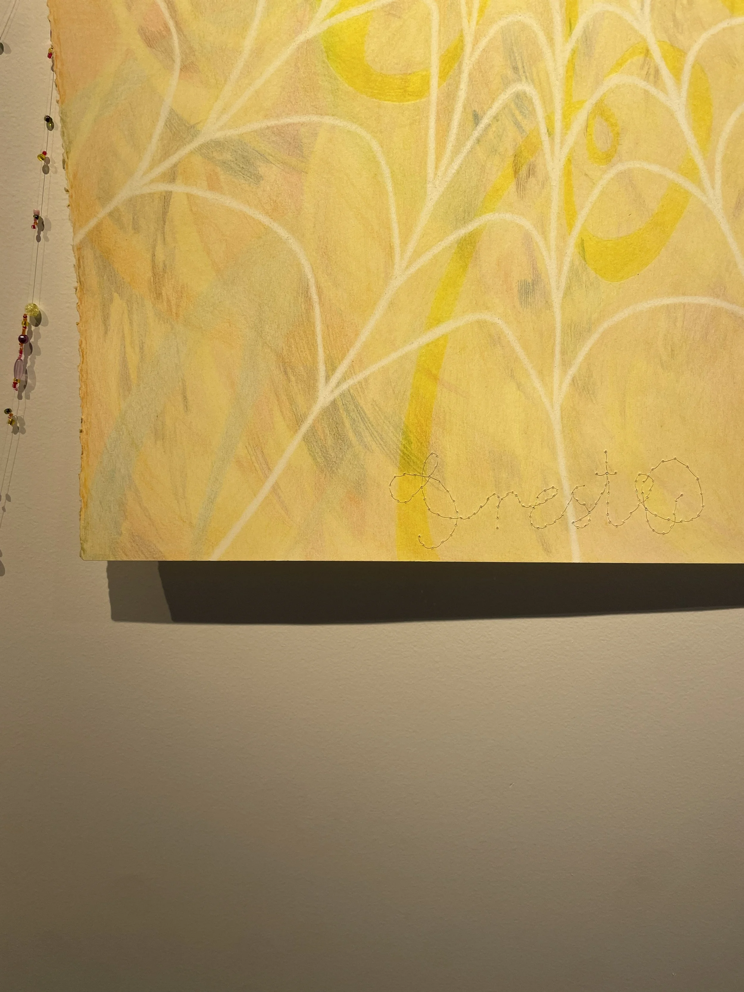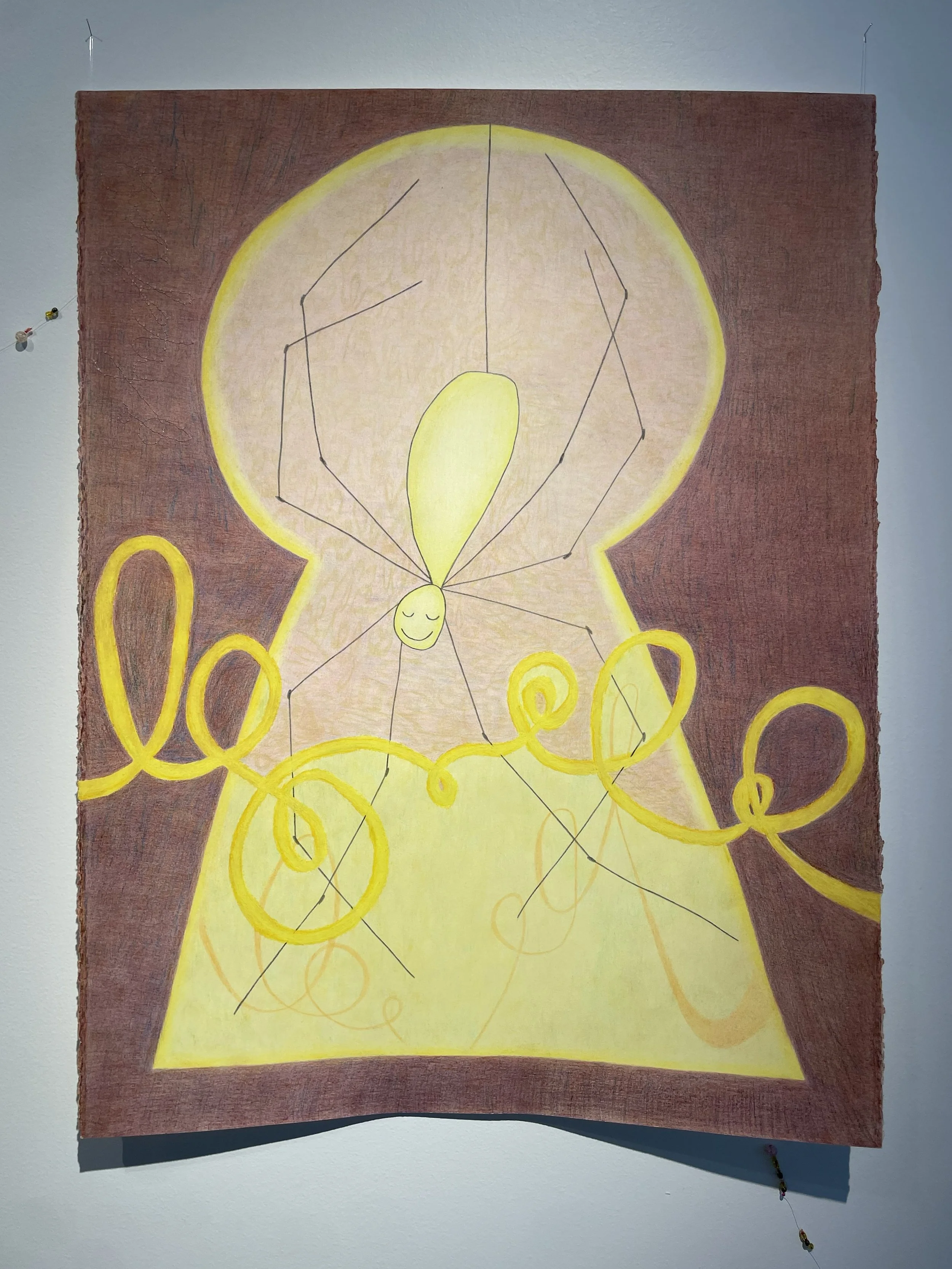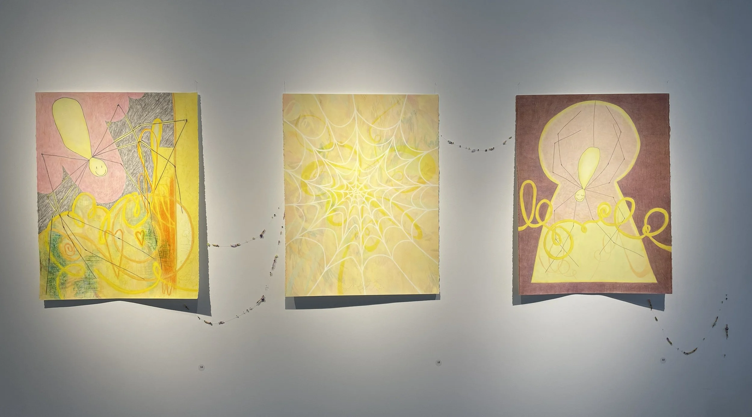 The process of both drawing and erasing allows for detailed layering, creating a depth that magnifies the miniature worlds of my subject matter. Fishing line and beading mimic the webs of spiders and allude to a lingering presence who is quietly claiming their territory. Overall, my choice in abstraction lends itself to a poetic and whimsical narrative aimed at contemplating the spaces we occupy and those we may or may not choose to share them with.